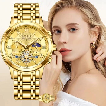 New LIGE Ladies Wristwatch Luxury Waterproof Luminous Gold Watch For Women Dress Stainless Steel Quartz Women’s Watches+Box