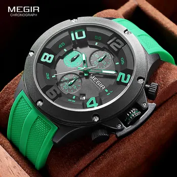 MEGIR Sport Big Quartz Watch Men Fashion Green Silicone Strap Waterproof Chronograph Wristwatch with Auto Date Luminous Hands
