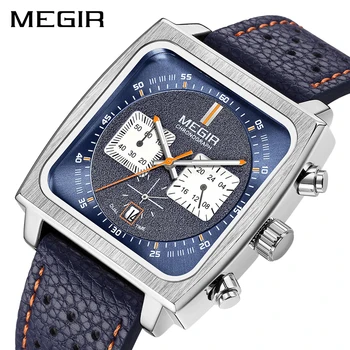 Megir Rectangle Dial Leather Strap Watch for Men Casual Blue chronograph quartz watches Man Wristwatch montre reloj часы мужские