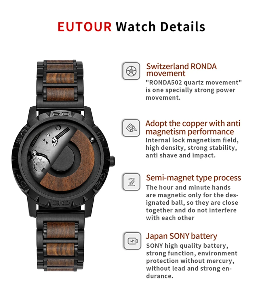– Each watch features two ball bearings that use magnetized technology to travel around the face of the watch.