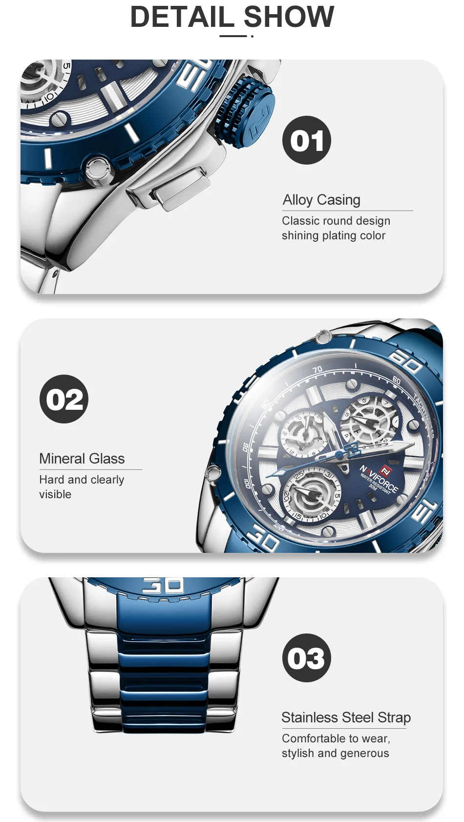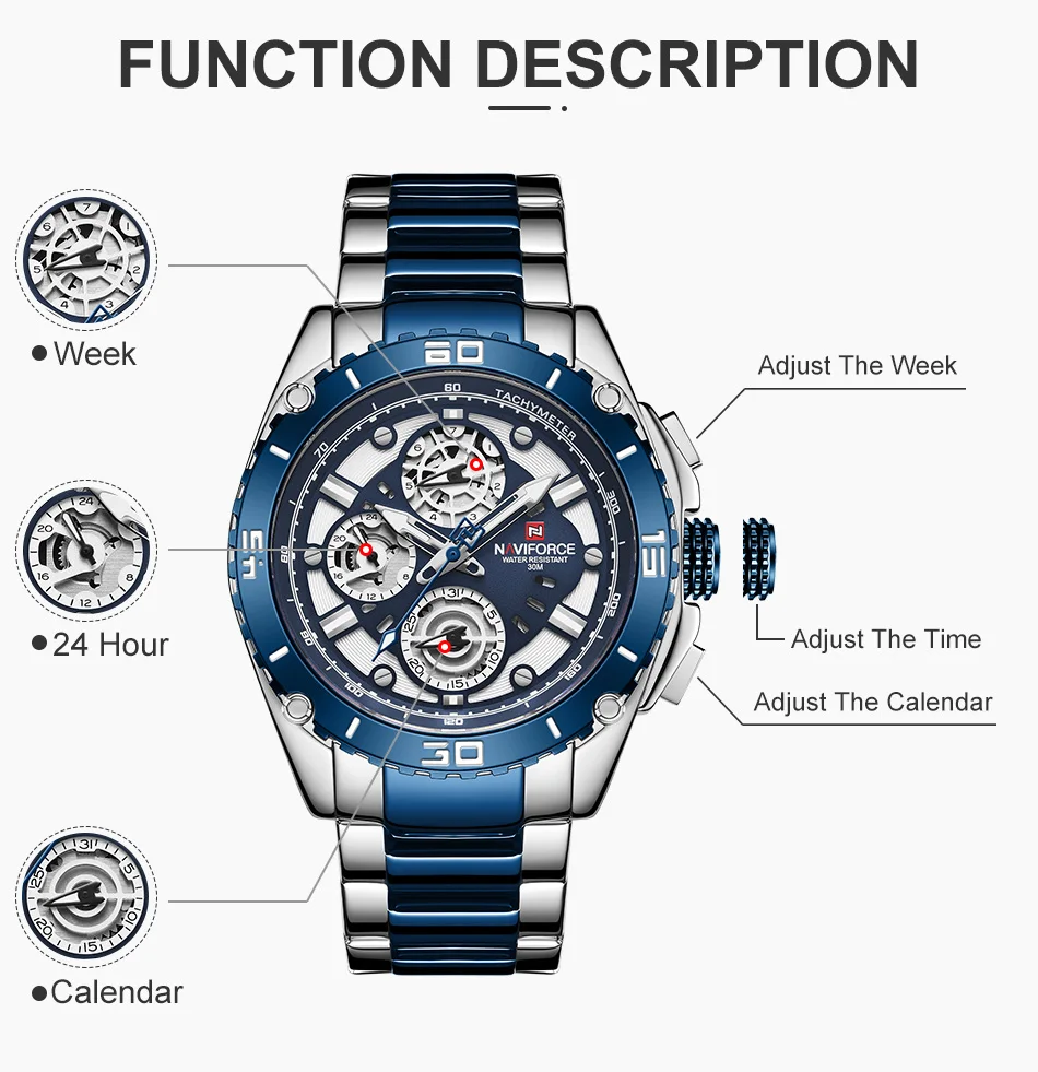 | Feature | Complete Calendar,Shock Resistant,Water Resistant,luminous hands,STOP WATCH,Multiple Time Zone,Week Display |