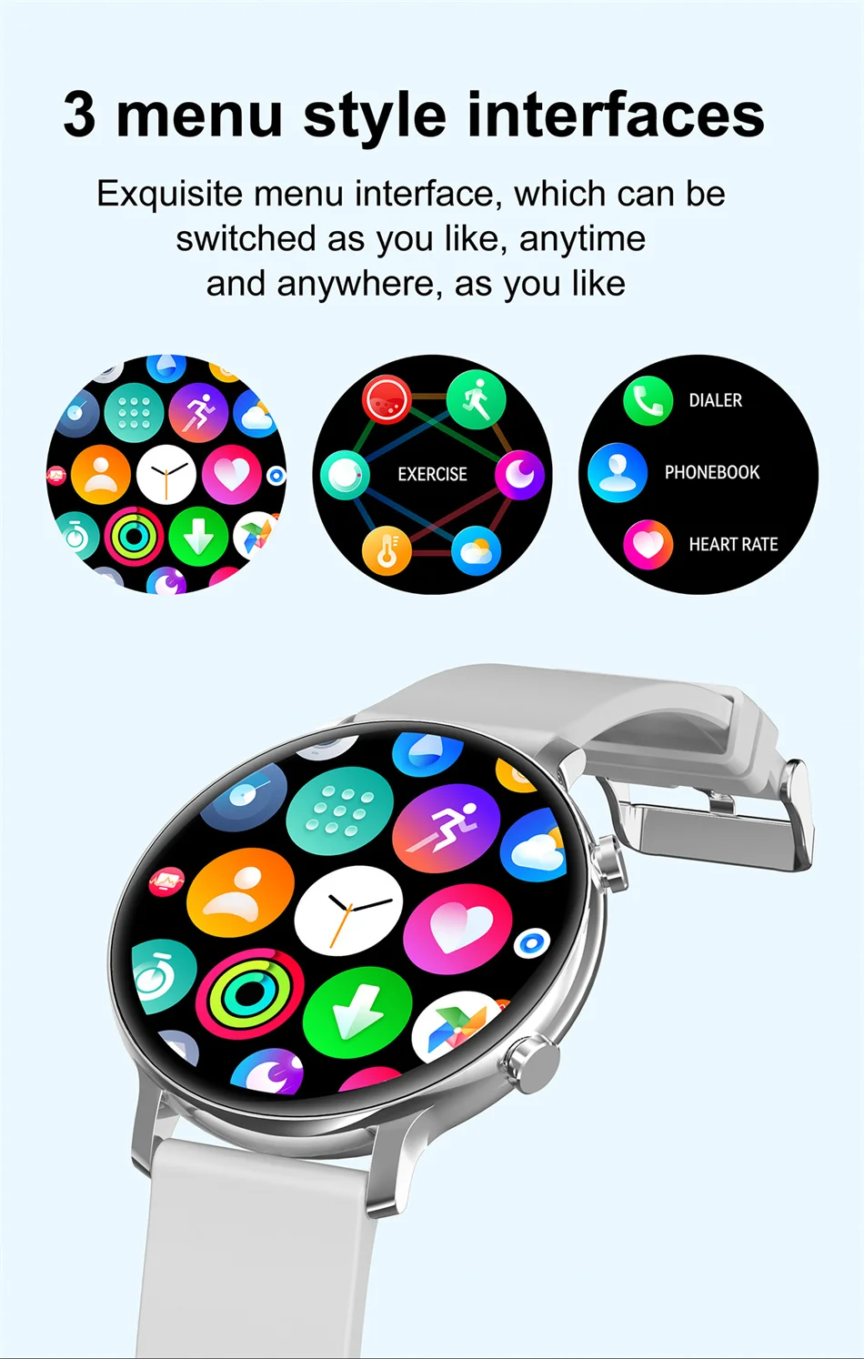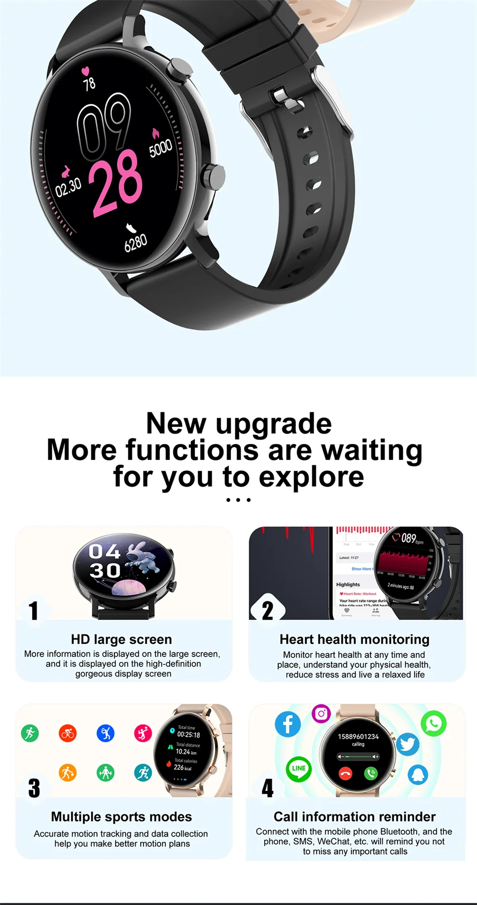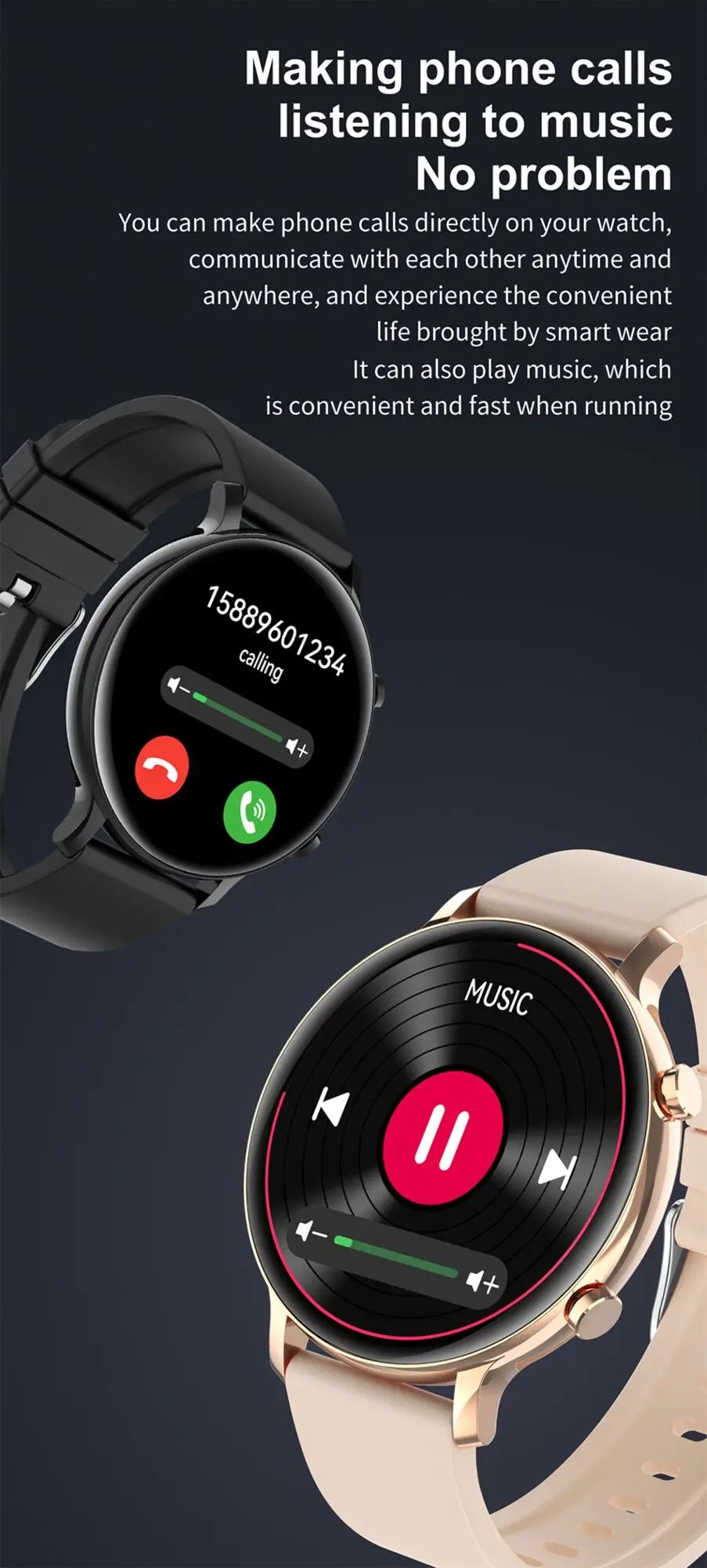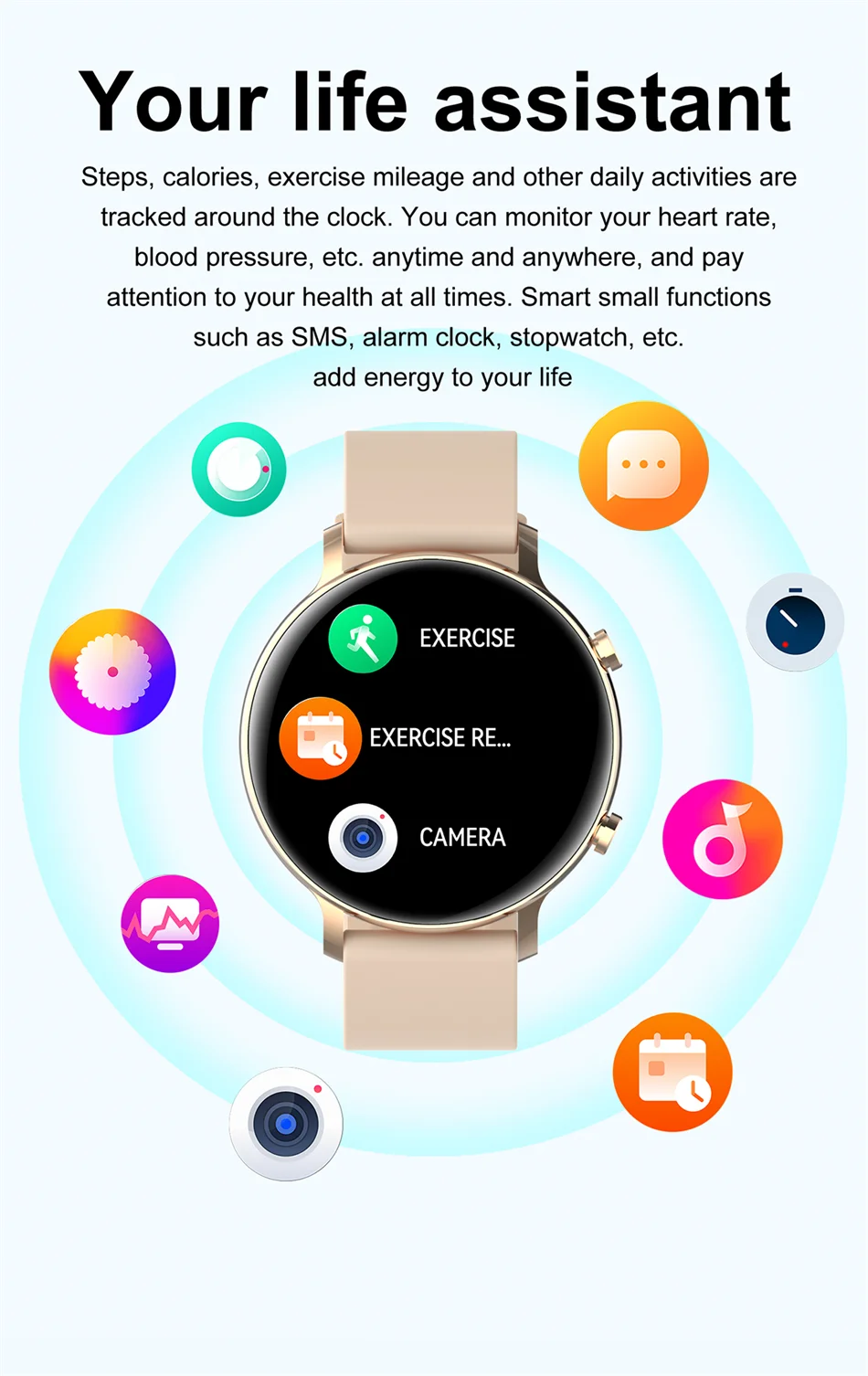 Answer/make phone calls, heart rate monitoring, blood pressure/oxygen electrocardiogram monitoring, sleep monitoring, exercise steps/calorie consumption/exercise time/WeChat exercise, call reminder and display, message push and display, remote control photography, music playback, multiple exercise modes, rosacea wake-up call, alarm setting, 5 dials, and the application can customize dialing